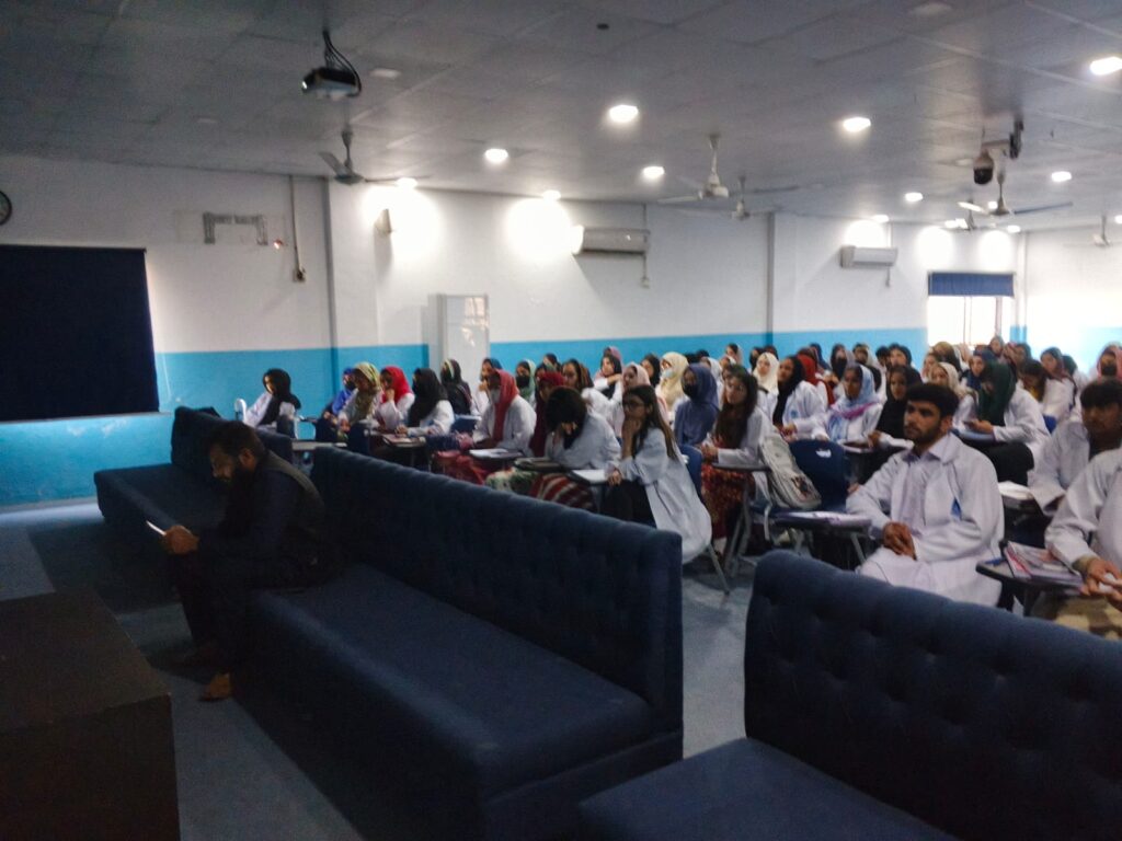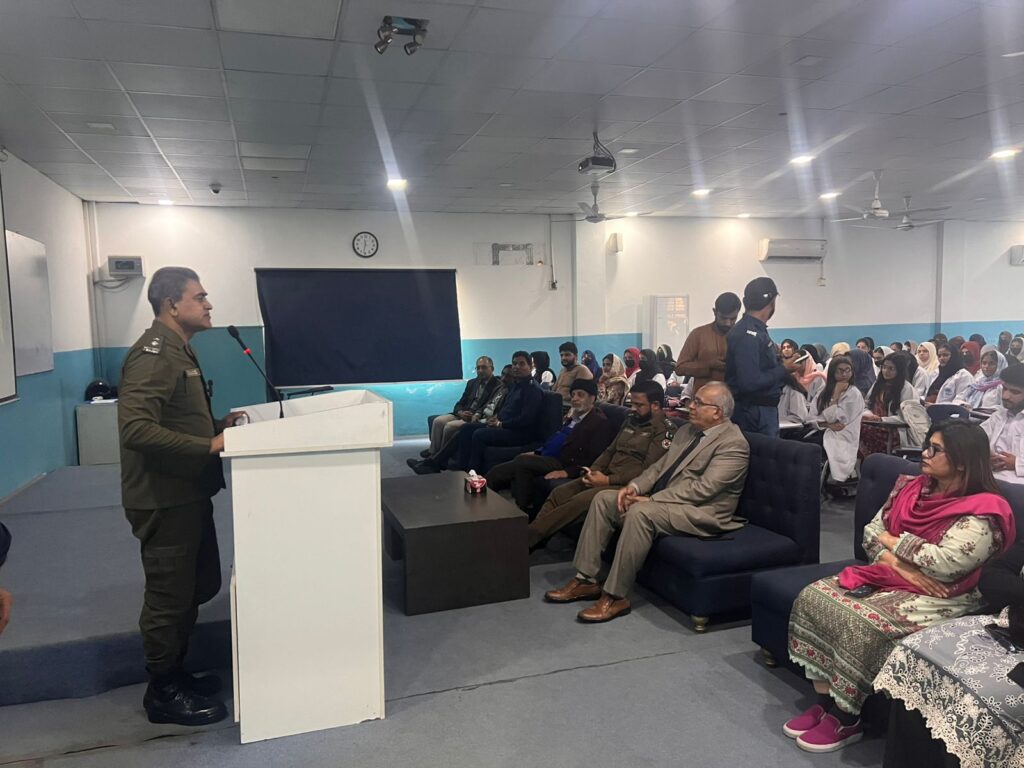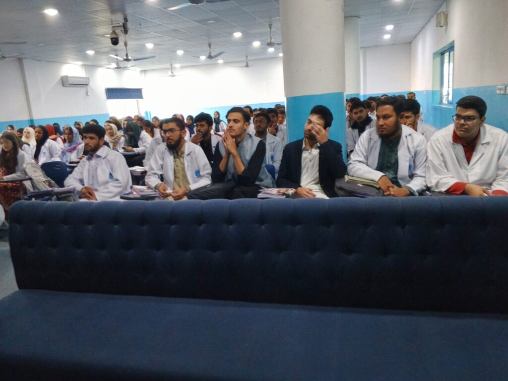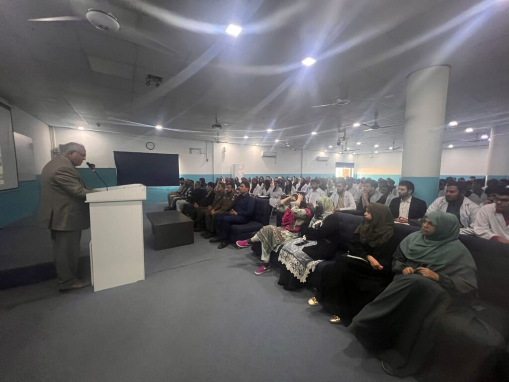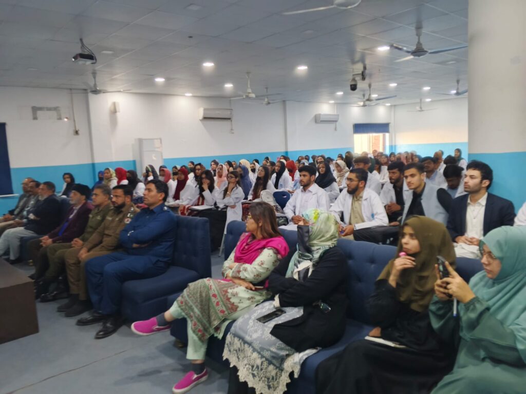 The seminar was honored by the presence of the Chief Guest, Nasir Javed Rana, Chief Traffic Officer (CTO) Faisalabad. In his address, he emphasized the importance of following traffic laws, observing speed limits, wearing helmets and seatbelts, and respecting road signals. He highlighted that road safety is a shared responsibility and that young professionals, especially medical students, play a vital role in spreading awareness within society. He further stated that preventing road traffic accidents is as important as treating victims, and educational institutions must actively support awareness initiatives.